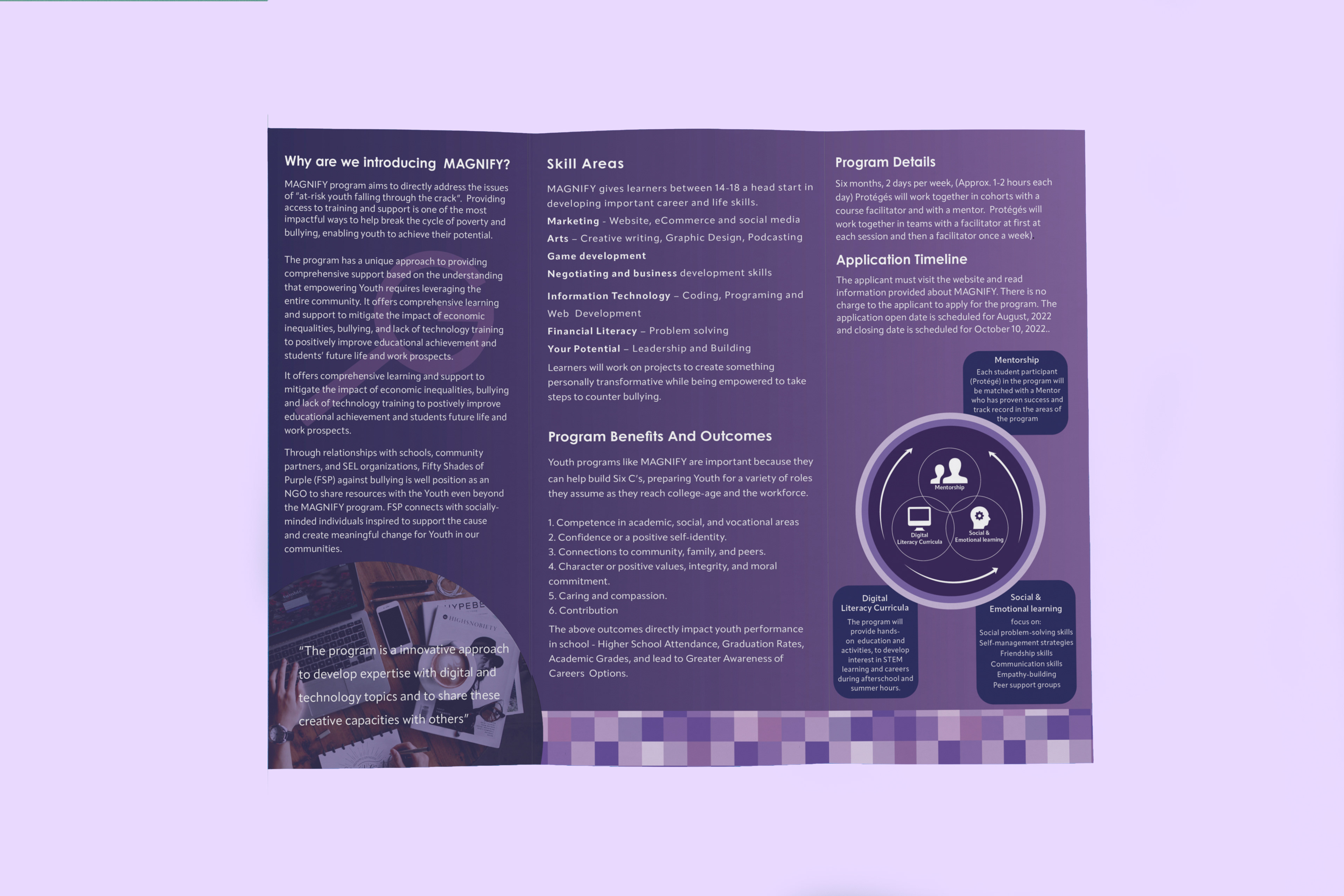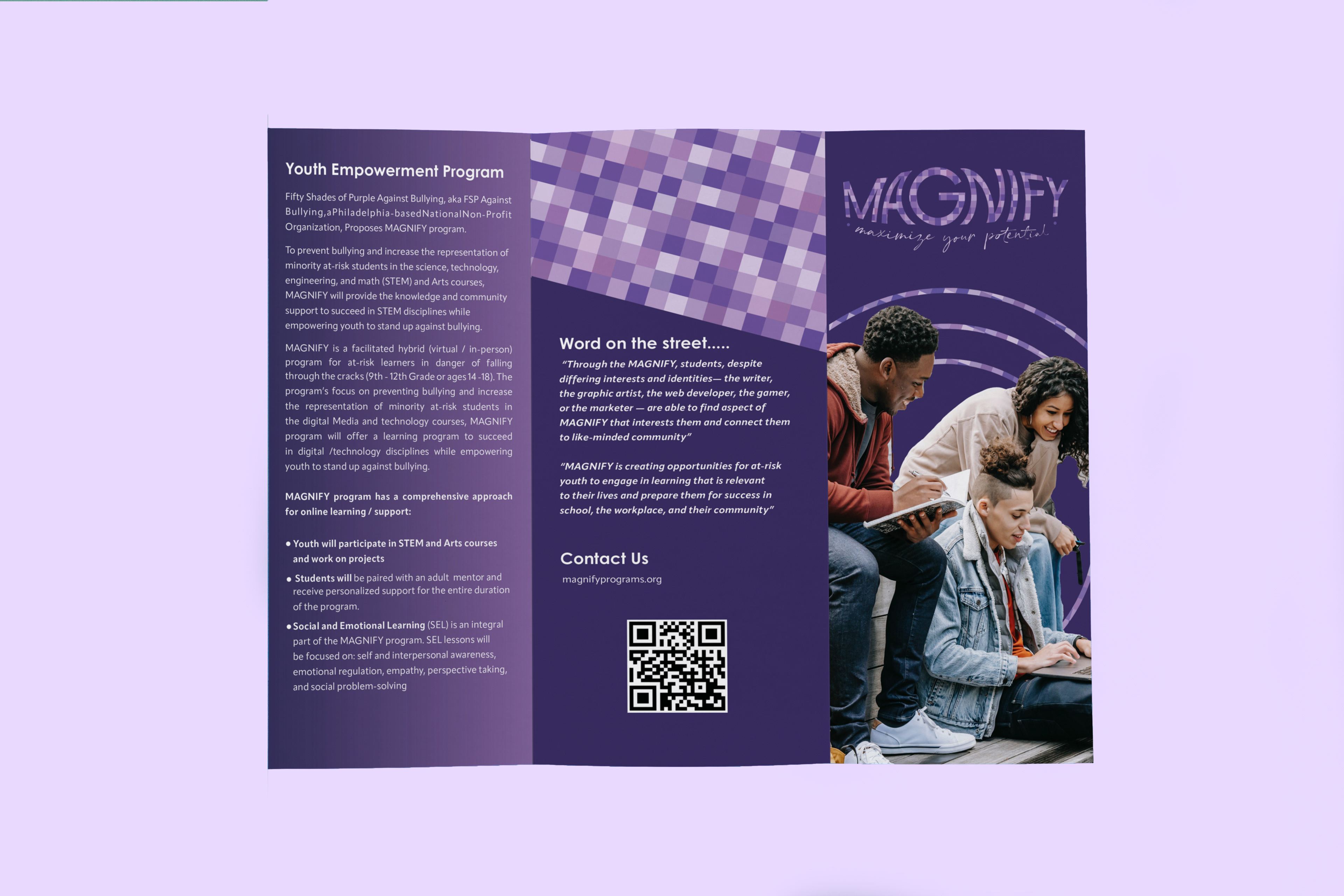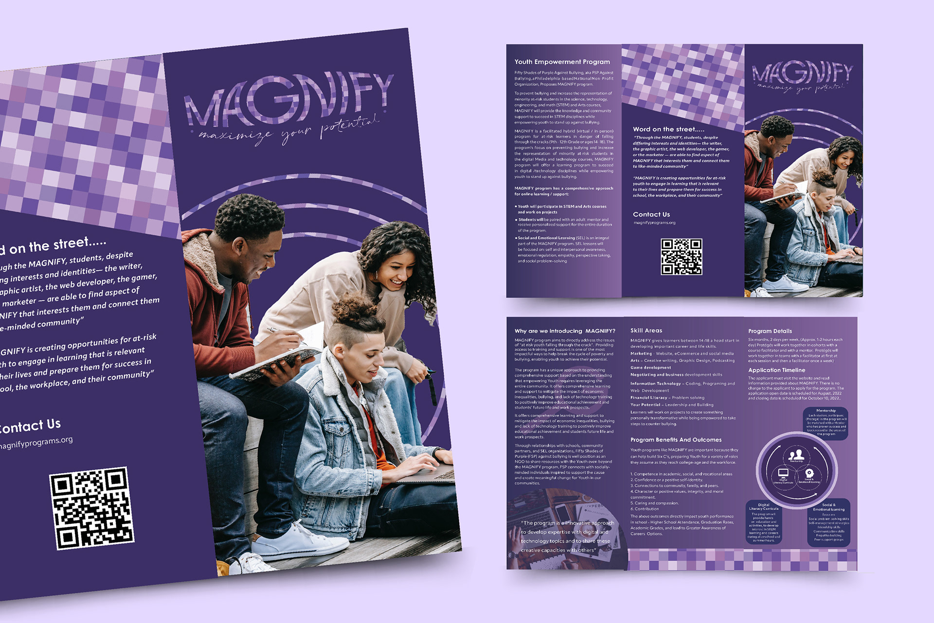 This brochure is for a new program called Magnify being launched in 2023 by Fifty Shades of Purple Against Bullying. The objective of this design was to create a clean practical layout with good use of color.